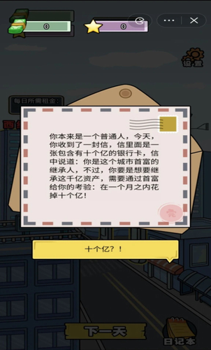 花光十个亿畅享版是一款以财富管理为主题的休闲模拟手游,采用清新明快的卡通美术风格,以西虹市首富经典剧情为蓝本创新改编。玩家将扮演继承巨额资产的幸运儿,开启三十天花光十亿资金的沉浸式挑战,在购置顶级豪宅、收藏限量超跑、组建私人团队等奢华消费中,体验财富支配者的别样人生。