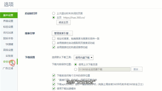2. 在二级菜单中选择「设置」入口,进入系统参数配置中心。建议新用户先浏览左侧导航栏,了解各项功能的分布位置。安全设置模块位于配置界面中段,包含cookie管理、广告过滤等关键安全组件。