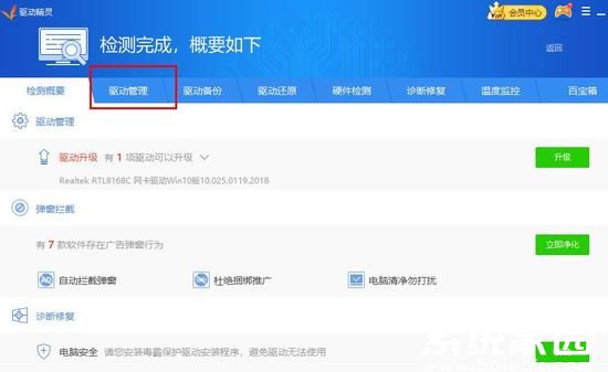 3、检测结果展示界面将呈现驱动状态列表,选择"驱动管理"分页。这里会以颜色标识区分:红色代表缺失驱动,黄色提示建议更新,绿色表示当前驱动状态正常。