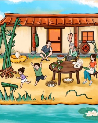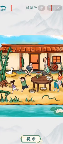 在庭院场景中找到祖母身旁的艾草束,将其悬挂于门框上方完成驱虫布置。河道清理环节需分步操作:先将木柴投入水中形成支撑结构,再运送青竹搭建龙舟骨架。角色调度方面,拖动三位男性家庭成员至龙舟位置启动竞渡准备,同时注意将酒坛放置在芦苇丛中的蛇形图案处触发隐藏剧情。