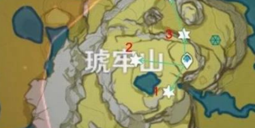 该区域存在垂直分布的11个点位,建议从最高处锚点出发,先采集山顶裸露矿层3颗,随后螺旋下降采收峭壁矿点5颗,最后在山脚溶洞内获取3颗。注意洞内存在元素机关需火系角色激活。