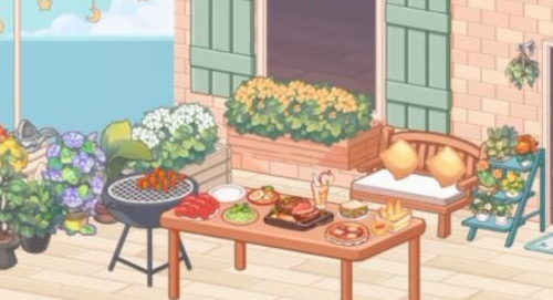 本关卡对应游戏第44章节,场景设计包含室内与露台双区域。玩家需通过点击门框实现场景切换,下方操作面板分为左右功能区:左侧工具栏存放各类家具装饰,右侧储藏区提供丰富食材道具。