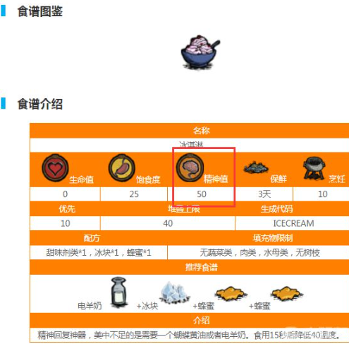 这款冷冻甜品具有50点精神值恢复的惊人效果,堪称应对精神危机的终极方案。零生命值影响的特性使其适用于战斗后的紧急恢复,但需注意其25点饱食度消耗可能影响长期生存规划。