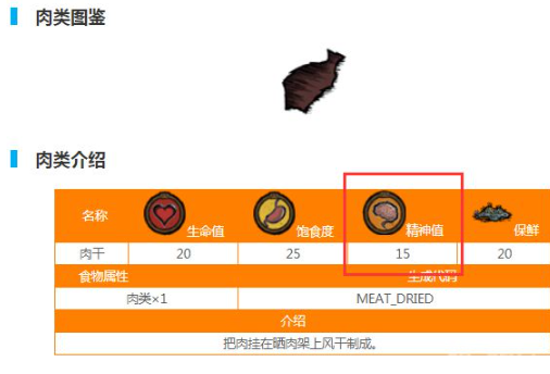 通过晾晒工艺制作的干燥肉制品能稳定提供15点精神值与20点生命值恢复。其耐储存特性使其成为远征探险必备物资,搭配烹饪锅可进一步延长保质期限。