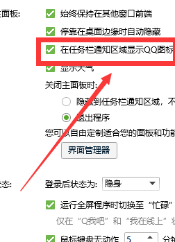 4、在「主面板」设置项的右侧区域,找到「在任务栏通知区域显示QQ图标」的复选框。取消勾选该选项后,系统托盘区的QQ图标会立即消失;需要恢复显示时,重新勾选即可激活图标。
