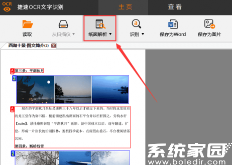 2、完成文件上传后,点击"版面分析"按钮启动智能识别系统。该功能会自动检测图片中的文字区域,对倾斜、扭曲的图文内容进行自动校正,确保识别准确率。处理过程中可实时预览调整效果,必要时可手动框选重点识别区域