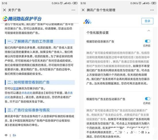 第三步在广告管理界面找到核心控制模块,点击蓝色「管理」按钮触发身份验证。系统会要求微信账号登录以确认操作权限,验证通过后可见四个核心设置项:基于个人信息推荐广告、基于互动行为推荐广告、基于用户分类推荐广告、基于第三方数据推荐广告。建议将这四类广告推荐开关全部调整为关闭状态。