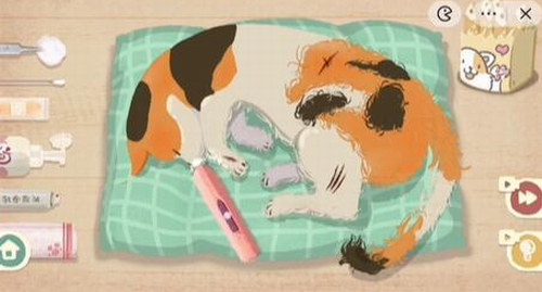 第一步需要使用温毛巾对猫咪进行全身清洁。操作时需注意顺着毛发生长方向轻轻擦拭,尤其要清理粘附在伤口周围的污垢。若发现猫咪出现抗拒动作,可点击右下角安抚按钮降低应激反应,待猫咪情绪稳定后再继续操作。