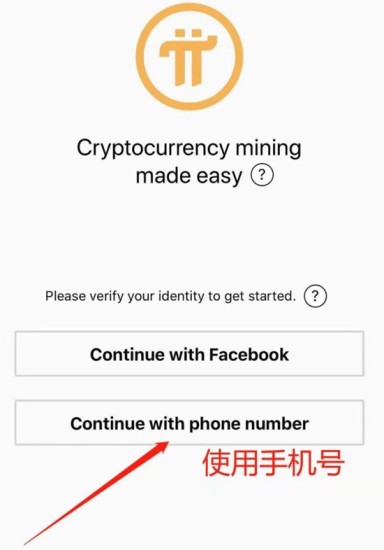 1、启动π币应用程序后,在登录界面选择「Continue with phone number」选项,该功能允许通过手机号进行身份验证。