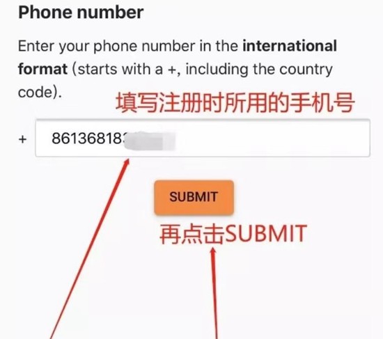 4、准确输入账户注册时登记的手机号码,确认信息无误后点击「SUBMIT」提交。此处需注意国际号码需包含国家区号,国内用户建议检查号码格式是否正确。