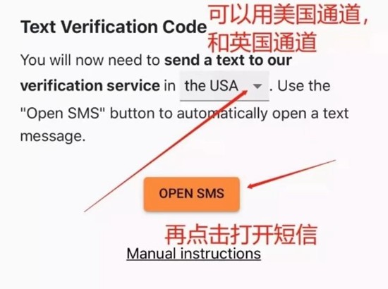 5、系统提供美国与英国两种短信验证通道,根据当前所在地区选择相应通道。点击「OPEN SMS」按钮将自动跳转至短信发送界面。